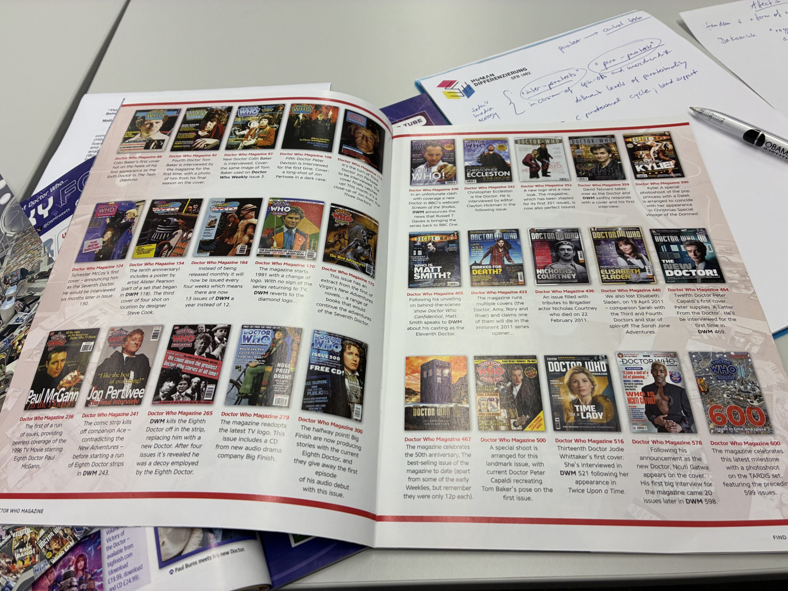 This talk will build on my analysis, in the Wiley Handbook of Magazine Studies, of the commercial fan magazine as a type of publication marked by fan-journalists’ “double-time” (Hills 2020). I also addressed the “intra-franchise fandom” characterising the officially-licensed Doctor Who Magazine’s production team (ibid). DWM is unusually long-running, and can be traced back to Doctor Who Weekly (1979-80). The Magazine has variously been analysed as a space in which fan interpretations became more sophisticatedly auteurist (Booy 2012), and as the beginning of official, TV-production attempts to paratextually orient fan readings (Sandifer 2014). The tension between these two types of reading illustrates how the commercial fan magazine remains caught between priorities of branding and giving a voice to “grassroots” fandom. This splitting has been widely testified to in fan studies, with its binaries of affirmational/transformational fandom (Hills 2014); of “new industry-driven” and “traditional” fans (Busse and Gray 2014); of “brand fans” versus “traditional fans” (Linden and Linden 2017: 37), and discussions of “corporatized fandom” (Booth 2019: 29).